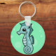 Um chaveiro com uma ilustração digital adorável de um pequeno cavalo azul de desenho animado em uma bolha verde-marinha coberta de fundo.