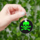 Chaveiro preto com um crânio amarelo-esverdeado brilhante e ossos cruzados.