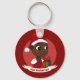 Chaveiro com uma ilustração de uma menina ou menino preto feliz sorridente e feliz, o bebê está vestindo roupas vermelhas e brancas e segurando um presente; com um modelo de texto editável para seu nome ou mensagem, design de Natal com fundo vermelho