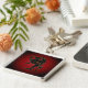 Dragão preto, bordado por uma linha fina de ouro sobre um fundo de gradiente vermelho e preto.