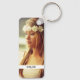 Foto e texto personalizados de dois lados, em chaveiro de metal branco modelo arredondado.