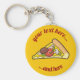 Ilustração de desenho animado com fatia de pizza em fundo amarelo. Dois campos de texto personalizados em círculo.