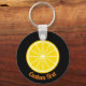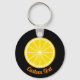 Uma fatia redonda de laranja. Cor de fundo personalizada. Texto personalizado de ambos os lados.