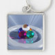 Uma imagem 3D criada em Vue, cheio de reflexões e luzes brilhantes de todas as direções. Cinco esferas coloridas de vidro azul, rosa, turquesa, laranja e diamante permanecem em uma pirâmide cercada por um anel branco translúcido. Eles sentam-se sobre um fundo deslumbrante de raios claros, azuis e brancos que convergem sob as cinco bolas de cristal.
