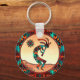 Este é um único "Um dos tipos" Chaveiro do sudoeste de Kokopelli! Ele apresenta um Kokopelli Sudoeste tocando flauta e dançando sob o sol no deserto... cercado por uma borda sudoeste em Turquesa, Laranja e Negro! Este é um Design de Arte Original do Artista Kerry Miller.