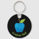 Maçã azul com ícone de folha. Cor de fundo personalizada. Texto personalizado de ambos os lados.