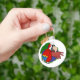 Esta chaveiro de Scarlet Macaw colorida tem um desenho animado do papagaio dentro a um círculo azul, com uma palmeira tropical atrás dela. Uma das asas do pássaro está estendida. O nome da espécie é impresso na parte inferior. Presentes únicos de Scarlet Macaw para amantes de papagaios.