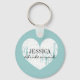 Chaveiro de madrinha personalizada | Coração azul-turquesa/azul-lacrimogêneo e coração branco-curado. Design de tipografia de na moda elegante. Faça um para noiva, damas de noiva, madrinha de casamento, florista, mãe da noiva etc. Cor de fundo personalizável para corresponder à sua festa de casamento ou chá de panela.
