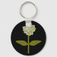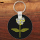 Este bonito chaveiro floral apresenta uma imagem digital de uma margarida com um caule verde com duas folhas verdes sobre ele e pétalas brancas e amarelas com um centro amarelo. As pétalas parecem brilhar com uma bela qualidade refletiva. A flor está sobre fundo preto para o máximo de contraste e o resultado é atordoante.
