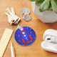 Um navio de foguetes azul e vermelho voa pelo espaço, neste jovem design de amantes do espaço!