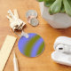 Este chaveiro apresenta uma imagem criada digitalmente que consiste numa série de bandas de cor azul e verde onduladas, alternadas, que se assemelham a uma série de bandas fluorescentes de nuvem.