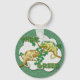 Esta cadeia-chave tem dois camaleões em galhos de árvores. Um é verde, o outro marrom. O texto diz, "Pense verde".