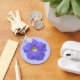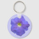 Este chaveiro bonito apresenta uma foto de uma petúnia azul com tons de roxo e um centro branco sobre um lindo fundo azul