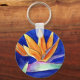 O fã vibrante, como a coroa de pétalas laranja de um pássaro de flor do paraíso, contrasta com o fundo azul real de pelúcia profunda. A pintura de flores de arte aquática apresenta uma visão de perfil do pássaro da flor do paraíso. Esta flor é conhecida como Flor de Crane na África do Sul. Personalize o pássaro do chaveiro de flores do paraíso com seu próprio texto e imagens usando o botão "Personalizar" para criar um presente especial de flor do Paraíso!