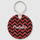 Hip e Trendy Chevron Glitter Look Chaveiro. Este legal chaveiro apresenta um padrão de zag em zague em forma de guiões em cima de um fundo de brilho vermelho da arte digital. Adicione texto a este design para lhe dar um toque pessoal.