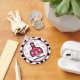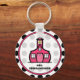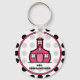Um chaveiro com fundo bolinhas preto-e-branco. Logotipo de dentro da escola cor-de-rosa quente. Personalize com seu nome.