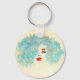 Este chaveiro único apresenta uma imagem de uma garota com chocantes caramujos azuis. É impressa a partir de uma pintura de aquarela original.
