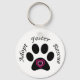 Esta chaveiro apoia o salvamento, adoção e promoção de animais. Uma bela pata com dois corações dentro rodeados pelas palavras adotar, promover e resgatar.