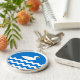 "Per fess wavy azure e barry wavy argent e azure, um contorno ingênuo de pato, faturado ou faturado."