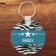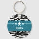 Tendy e moderna Chaveiro da Estrela Sassy Zebra apresentando um fundo de impressão em preto-e-branco e uma ousada borda azul real adornada com um divertido motivo de estrela. Este design feminino pode ser personalizado com o texto personalizado de sua escolha. Clique em "Personalizar" para encontrar mais opções de personalização.