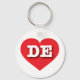 Esta cadeia de teclas apresenta um coração vermelho vibrante contendo as letras maiúsculas, brancas e em negrito DE, a abreviatura oficial de Delaware, o primeiro estado.