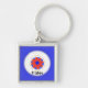 Um frisbeque branco com designs vermelhos e azuis sobre fundo azul. A palavra "frisbee" pode ser alterada ou removida. O melhor esporte em disco voador.
