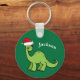 Incrível dinossauro verde sorrindo e parecendo muito fofo em um chapéu de Papai Noel vermelho de férias. Personalize este adorável presente de chaveiro de Natal para crianças com o nome do destinatário para torná-lo ainda mais personalizado. Legal menino presente para uma criança.