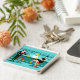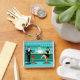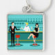 Cada hora é feliz com este Chaveiro do coquetel Retro. O design moderno do meio século apresenta um vibrante estilo, minimalista, de 1960 desenho de um bar de coquetel clássico. Contra o pano de fundo de uma parede aqua, podemos ver filas de óculos de bebida. Pelo menos podemos ver os teais silhuetas de óculos de bebida. A julgar pelas formas do material, este bar está bem equipado para molhar o assobio, seja qual for a sua preferência pela bebida. Um barman mais competente e personável é manejar o bar com sotaques amarelos. O jovem barman está vestindo uma camisa branca e primitiva com gravata arco preta. Sua boa aparência, cabelo louro e óculos de hipster pretos nos dão todas as razões para acreditar que ele passa seus dias como um ator em luta ou um super-herói. Por um lado, o bonito mixologista está entregando um martini a um cliente do lado oposto do bar. O cliente que espera é um cavalheiro de ombros largos com um terno preto e gravata vermelha. Ele é o tipo de sujeito que é descrito como alto, escuro e bonito mesmo quando ainda é horas até a hora de fechar. Parece que há um banco de bares vermelho e cromo com o nome do Sr. Debonair. No entanto, para não ser presunçoso, ele pergunta, "Desculpe-me. Este assento está ocupado?" Ele está perguntando à garota cabeleira no banco de bares vizinho. Ela é do tipo "garota ao lado", se você vive ao lado de uma beleza perfeita com uma figura que não desiste. Ela está vestindo um vestido preto e segurando um martini em uma mão. Ela espera que ela e o cavalheiro que se aproxima tenham mais em comum que a sua preferência pela bebida e a escolha da cor da roupa. Parece que esta noite ficou interessante. Saúde para você!
