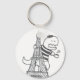 Esta é uma chaveiro que mostra meu desenho francês de dinossauro onde ele escala a torre Eiffel, vestindo uma camisa listrada e uma bereta, enquanto bebendo uma xícara de café