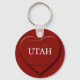 Uma ilustração gráfica 3d de um mapa de coração e Utah com o texto Utah em um chaveiro. Arte original: Direitos autorais Charmaine Paulson