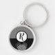 Aqui você encontrará um chaveiro com um design elegante, mostrando um minicarril preto e um sutil motif preto de smoking completo com uma gravata de bolso. Sua letra monográfica toma palco central, realçada contra um fundo circular branco e preto.