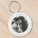 Elegante, chaveiro de orçamento fúnebre chic para celebrar a memória de seu amado no estilo moderno de design minimalista em um simples fundo branco limpo. O design pode ser facilmente personalizado com sua própria foto e texto para criar um tributo especial para o funeral, memorial ou celebração da vida do seu ente querido. A imagem mostrada é apenas para fins de ilustração para ser substituída pela sua própria foto. A imagem marcadora é de uma bela mulher com cabelo encaracolado escuro vestindo um cachecol e sendo alvejada em preto e branco monocromático.