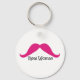 Um chaveiro cor-de-rosa e preto giro para mulheres com bigode rosa giro e um ditado engraçado que diz: Mulher Real. Uma chave de tendência para a mulher não ter medo de esportes.