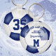 Este teclado de futebol fácil de personalizar apresenta a imagem realista de uma bola de futebol que tem painéis azuis e brancos, sobre os quais você pode personalizar o nome do atleta, número de camisa, nome da equipe e mascote e ano na frente e letra de monograma ou varsidade no verso - por katz_d_zynes