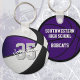 Este legal chaveiro do tema de basquete apresenta a imagem realista de uma bola de basquete que tem painéis coloridos roxos, brancos e pretos alternados na frente e uma simples forma de basquete roxa no verso - personalize facilmente com o nome do jogador & número de camisa na frente e na escola ou nome do clube e nome do mascote no verso - por katz_d_zynes