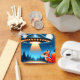 Esta chaveiro tem uma raposa e uma espaçonave alienígena.