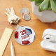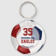 Este chaveiro de futebol feminino com cores vermelhas e azuis apresenta uma bola de futebol clássica com painéis vermelhos, azuis e brancos - personalize o nome do jogador e o número de camisa mais a escola e o nome do mascote da equipe - por katz_d_zynes