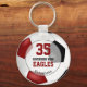 Este chaveiro de futebol personalizado para raparigas com cores negras e vermelhas da escola apresenta uma bola de futebol simples e clássica com painéis em preto, vermelho e branco - personalize o nome do jogador e o número de camisa mais o nome da escola e do mascote da equipe - por katz_d_zynes