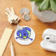 Um cão de bola de tênis azul louco tem uma bola amarela amarrada nos dentes enquanto ele levanta os braços. Por baixo lê-se "Flyball Fanatic." Chaveiro de bola de flyball bonita!