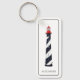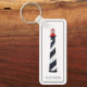 Esta chaveiro de inspiração costeira apresenta um clássico farol náutico em faixas brancas e pretas com vermelho sobre fundo branco. Personalize com sua escolha de nome ou texto especial na frente e atrás.