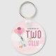 Diversão e diversão ganso, chaveiro do círculo de metal para o grande dia do seu pequeno. Este design "Dois Bobos" apresenta um ganso branco feliz flutuando com balões cor-de-rosa contra um fundo do céu suave. Personalizado com o nome do seu filho para torná-lo uma combinação perfeita para um bobo ganha a segunda festa de aniversário. Esta chaveiro faz uma simples, fácil, pronta para ir, festa por presente ou guardar.