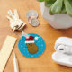 Feliz batata de Natal, com um chapéu vermelho brilhante de Papai Noel. Fundo azul coberto com flocos de neve brancos espumantes.