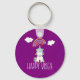 Chaveiro com uma bela ilustração de um unicórnio branco sentado no seu rabo sorrindo e parecendo feliz. Nuvens sorridentes e um arco-íris. Texto diz: Feliz Víblias. Imagem de uplifting adorável. Definido em um fundo de cor d'água roxa e rosado.