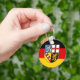 Button Keychain with flag of Saarland; design with horizontal tricolor of black, red and yellow (golden), with state’s coat of arms in the center