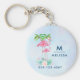 Chaveiro personalizado com um nome, número inicial e telefone. Projetado com uma ilustração de um flamingo cor-de-rosa mãozinho e bebê parado em um leito de flores florais suculentas com palmeiras verdes balançando nas costas. Tropical e bonito. O fundo é uma aquarela azul-claro de verão com pistas de púrpura.