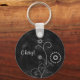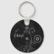 Um chaveiro preto e branco de estilo boêmico com desenho de giz floral branco de um dente-de-leão e outras flores silvestres em meio a espirais de filigrana contra um fundo de ardósia de chalkboard preto. Personalize este bonito design de quadro-negro adicionando seu nome.
