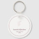 Folha simples, branca e rosa, limpa | chaveiro de casamento moderno, apresentando escrevendo de morango sobre fundo branco limpo com uma simples folha de poeira rosa, esses chaveiros quic podem ser personalizados com seus nomes e data de casamento. O toque perfeito para casamentos, chás de panela, chás de fraldas, graduações e aniversários. Projetado pela RevivaDesigns