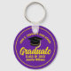 Este moderno chaveiro formando mais velho roxo e amarelo personalizado apresenta o seu segundo grau ou nome da faculdade para a classe de 2025. Personalize com o seu ano de graduação com o script de chic manuscrito e o boné de formando preto para um presente de cadeia de chave de graduação personalizada de excelente.