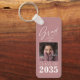 Uma moda, dois novos lados, alumínio resistente, chaveiro de Formando - teclado com sua foto na frente. Todos Personalizados, com "Formando" em um roteiro elegante de tinta com "Classe de, Ano, Nome da Escola e Seu Nome" em tipografia moderna. A foto do formando é acentuada articamente com uma delicada placa de gradiente. O texto e o molde são brancos com o fundo em uma cor poeirenta de rosa. Se desejar, edite facilmente a cor de fundo na cor primária da sua escola. A ideia perfeita de presente de graduação para estudantes de segundo grau, faculdade e universidade.