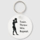 Uma corrente de chave redonda com um gráfico de um jogador de basquetebol a preparar-se para jogar uma bola no estilo Arte grego com as palavras "Comboio. Jogue. Ganhe. Repita." Definitivamente a fórmula de vitória universal para qualquer desportista.